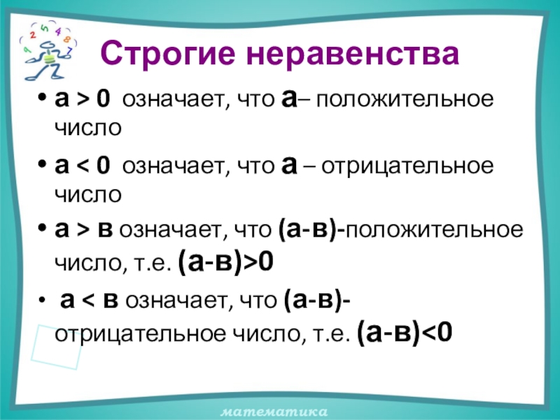 Строгие неравенства а > 0 означает, что а– положительное числоа < 0 означает, что а – отрицательное