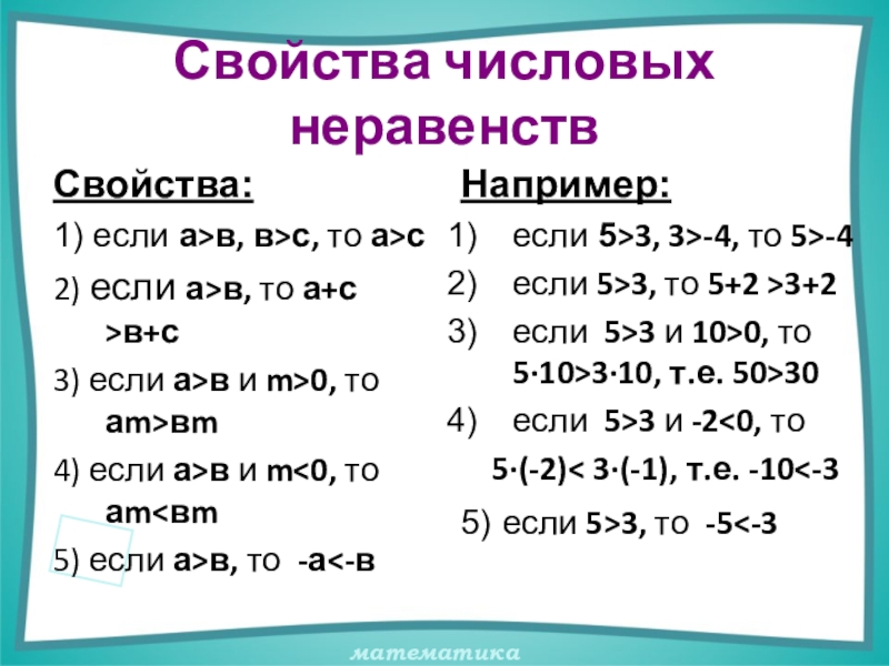 Свойства числовых неравенствСвойства:1) если а>в, в>с, то а>с2) если а>в, то а+с >в+с3) если а>в и m>0,