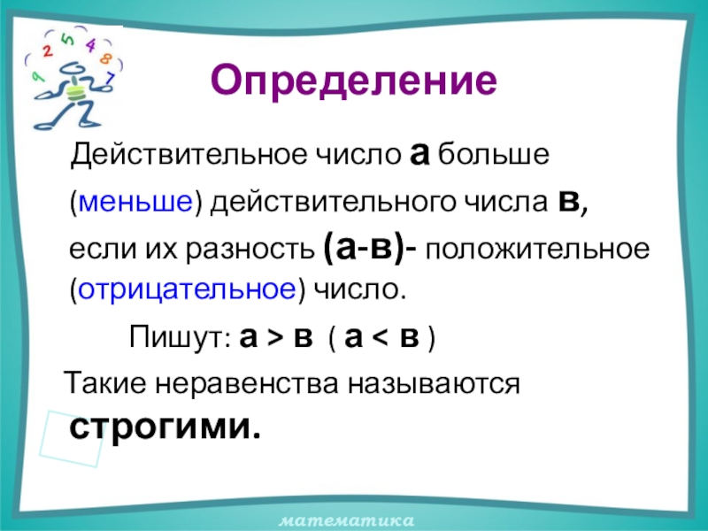 Определение   Действительное число а больше (меньше) действительного числа в, если их разность (а-в)- положительное (отрицательное)
