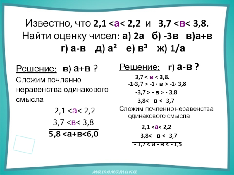 Презентация, доклад по алгебре Свойства числовых неравенств