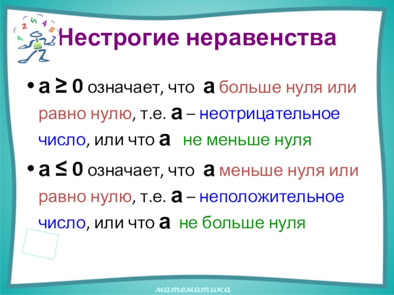 Нестрогие неравенстваа ≥ 0 означает, что а больше нуля или равно нулю, т.е. а – неотрицательное число,