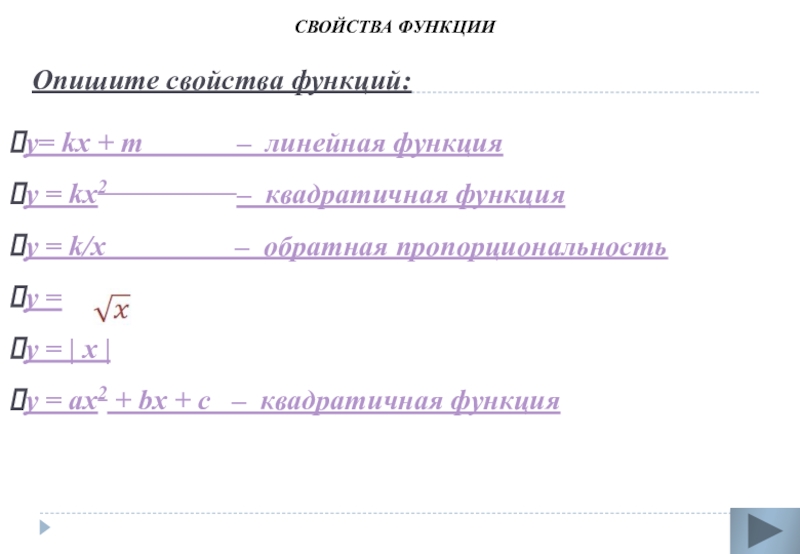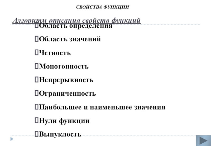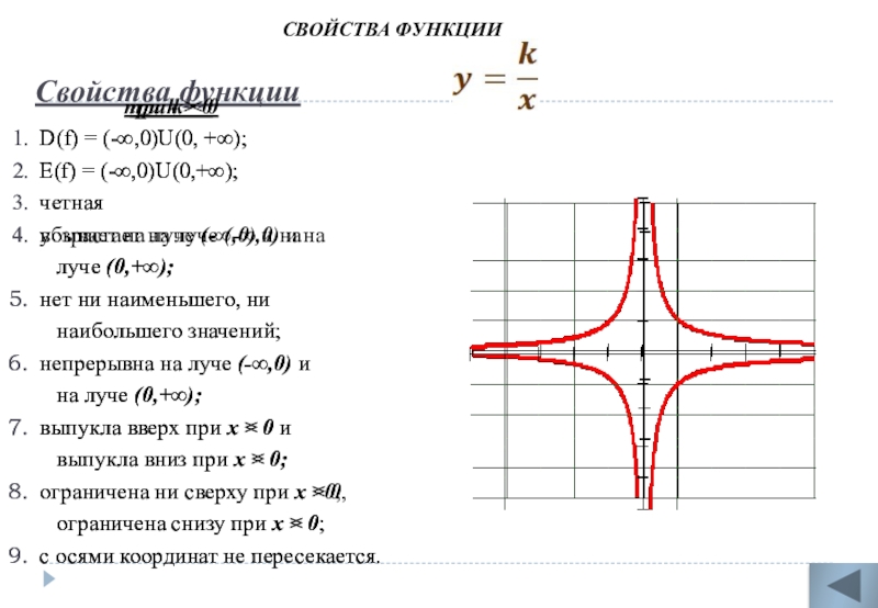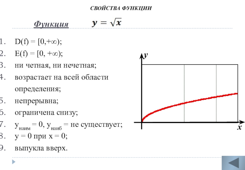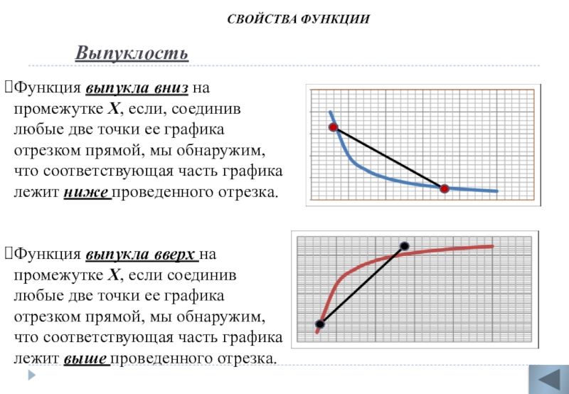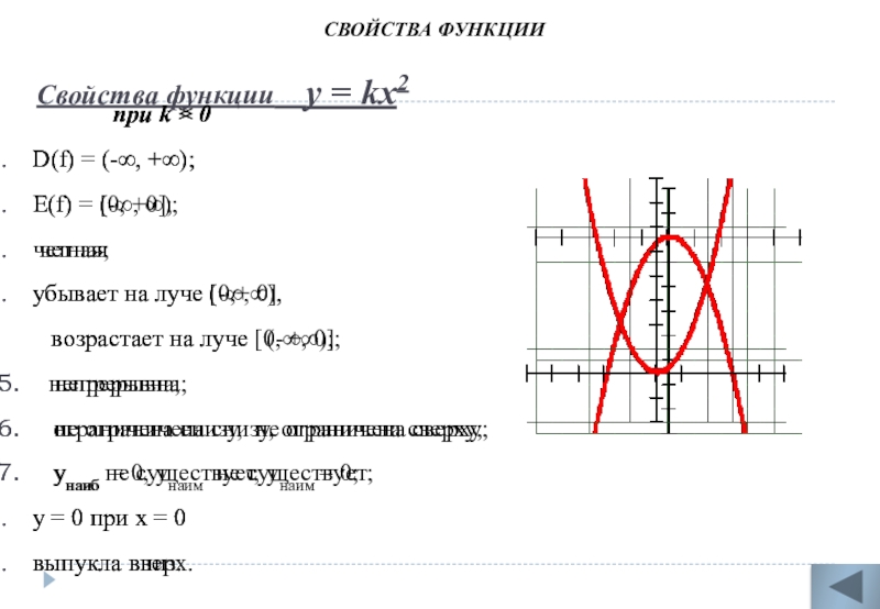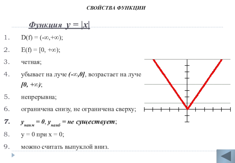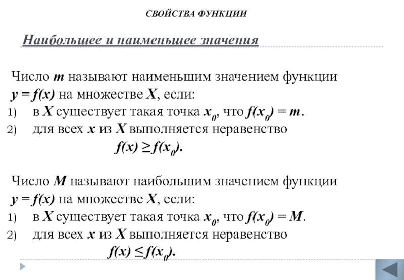 Функция y = f(x) называется четной, если область ее определения есть множество, симметричное относительно начала координат, и если f (-x) = f (x) при любом х Х. Нечетная функция симметрична относительно начала координат.
