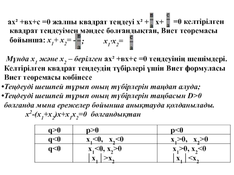 Мұнда х1 және х2 – берілген ах² +вх+с =0 теңдеуінің шешімдері.
