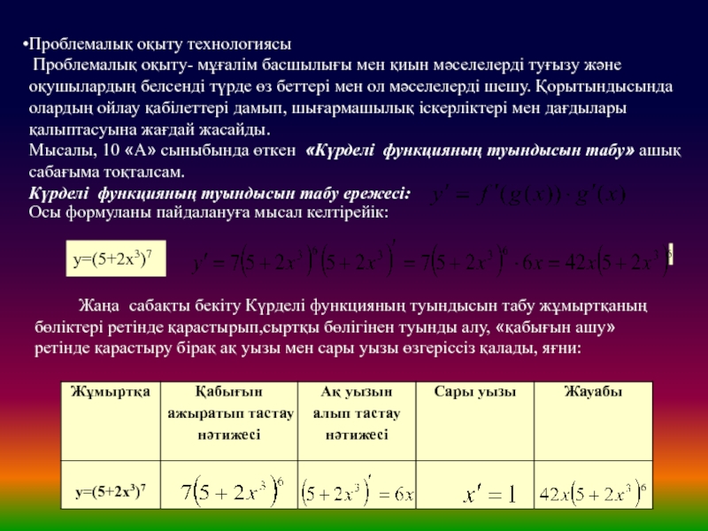 Жаңа сабақты бекіту Күрделі функцияның туындысын табу жұмыртқаның бөліктері ретінде қарастырып,сыртқы бөлігінен туынды алу, «қабығын ашу» ретінде қарастыру бірақ ақ уызы мен сары уызы өзгеріссіз қалады, яғни:
