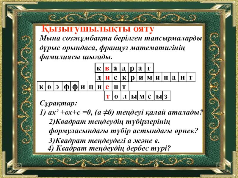3)Квадрат теңдеудегі а және в.