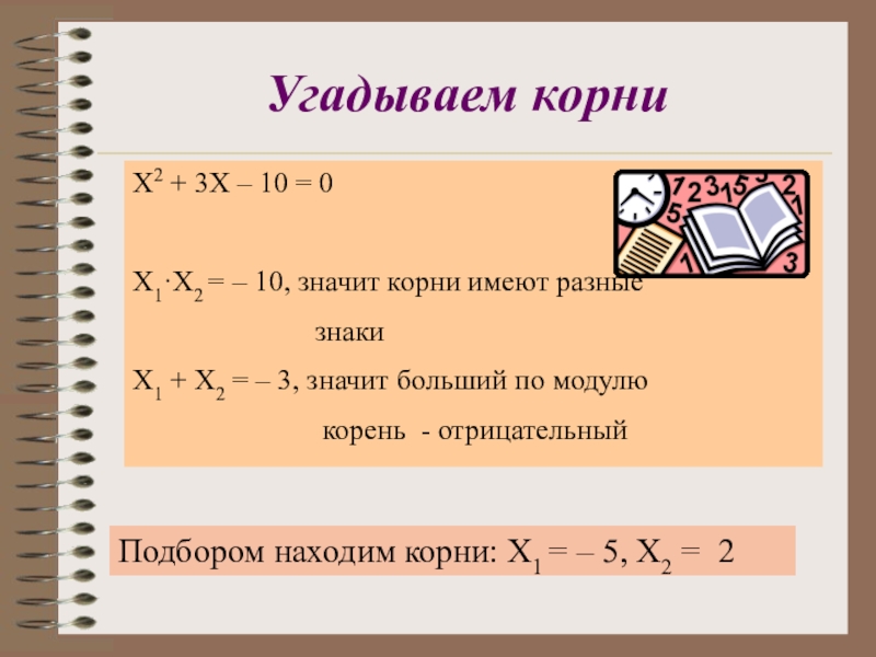Подбором находим корни: Х1 = – 5, Х2 = 2