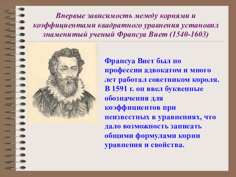 Впервые зависимость между корнями и коэффициентами квадратного уравнения установил знаменитый ученый Франсуа Виет (1540-1603)