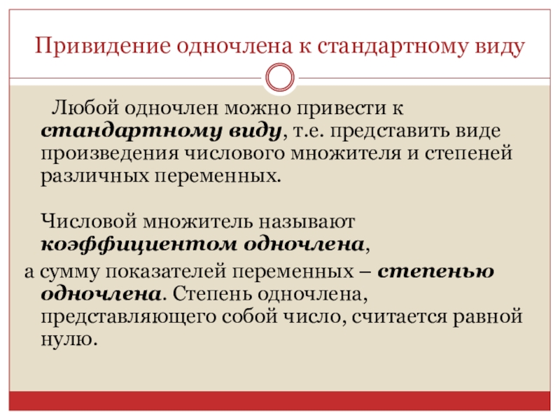 Привидение одночлена к стандартному виду	Любой одночлен можно привести к стандартному виду, т.е. представить виде произведения числового множителя