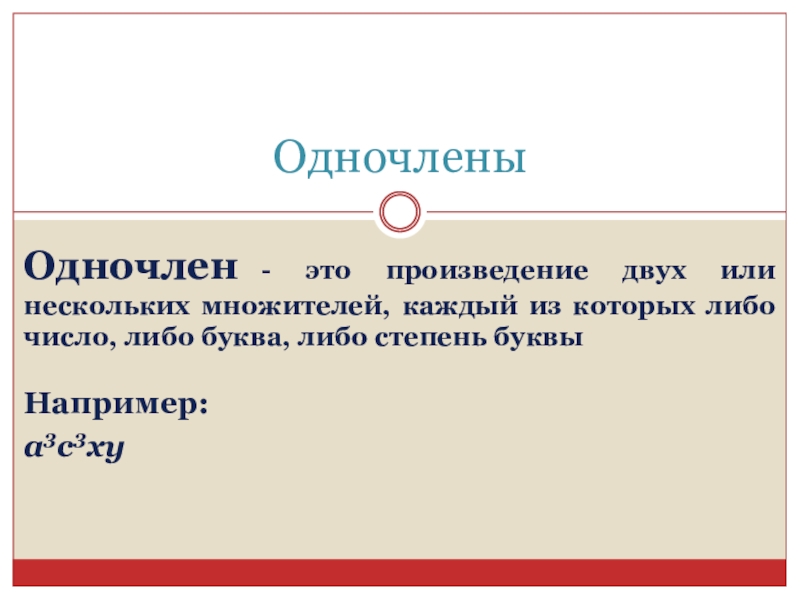 ОдночленыОдночлен - это произведение двух или нескольких множителей, каждый из которых либо число, либо буква, либо степень