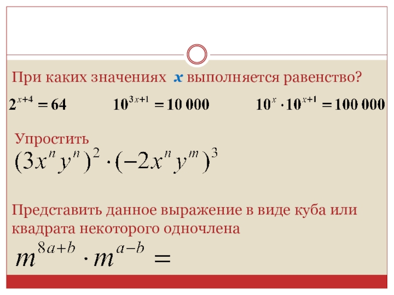При каких значениях х выполняется равенство?УпроститьПредставить данное выражение в виде куба или квадрата некоторого одночлена