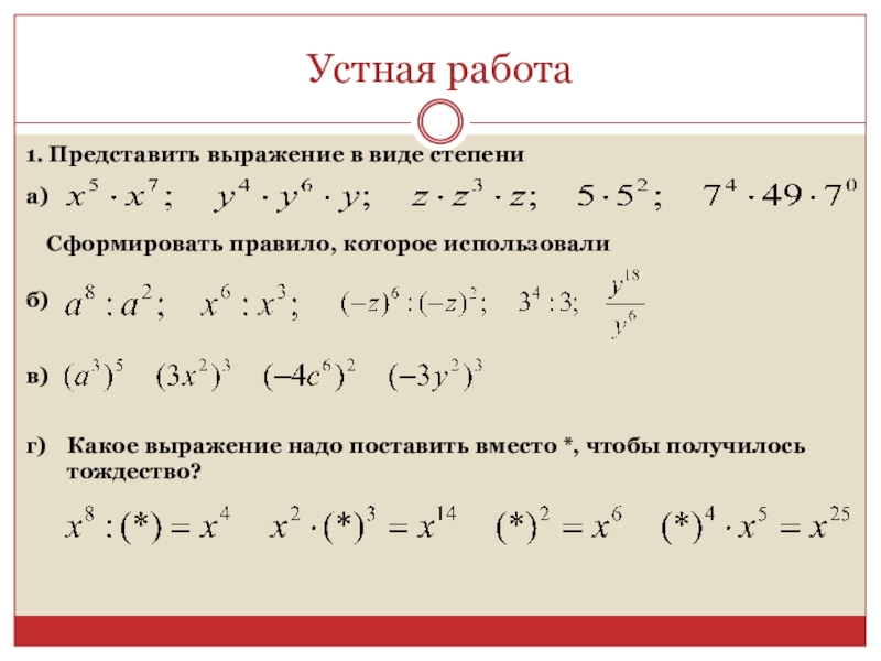 Устная работа1. Представить выражение в виде степениа)Сформировать правило, которое использовалиб)в)г)Какое выражение надо поставить вместо *, чтобы получилось