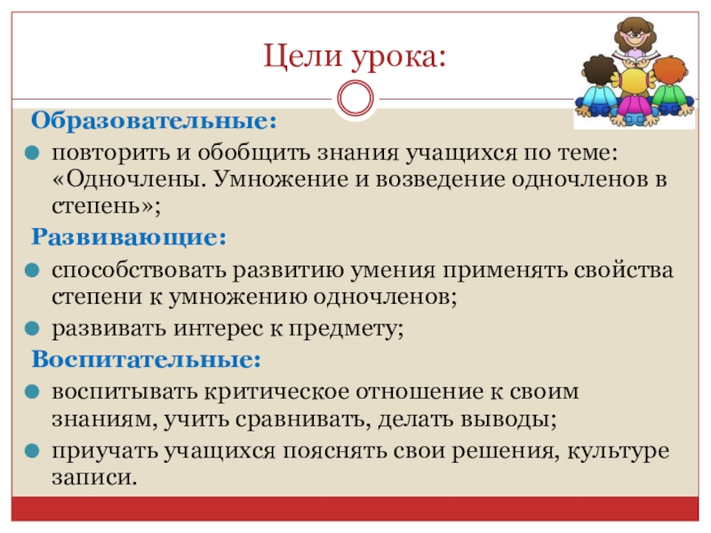 Цели урока:Образовательные:повторить и обобщить знания учащихся по теме: «Одночлены. Умножение и возведение одночленов в степень»;Развивающие:способствовать развитию умения применять свойства степени к умножению одночленов;развивать интерес к предмету;Воспитательные:воспитывать критическое отношение к своим знаниям, учить сравнивать, делать выводы;приучать учащихся