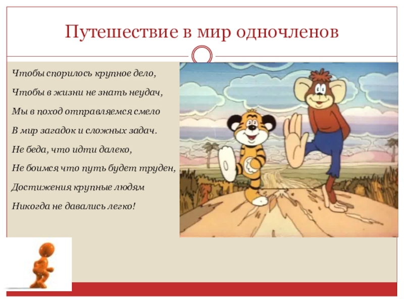 Путешествие в мир одночленовЧтобы спорилось крупное дело,Чтобы в жизни не знать неудач,Мы в поход отправляемся смелоВ мир