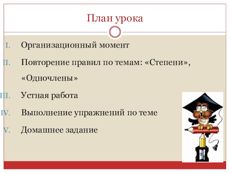 План урокаОрганизационный моментПовторение правил по темам: «Степени», «Одночлены»Устная работаВыполнение упражнений по темеДомашнее задание