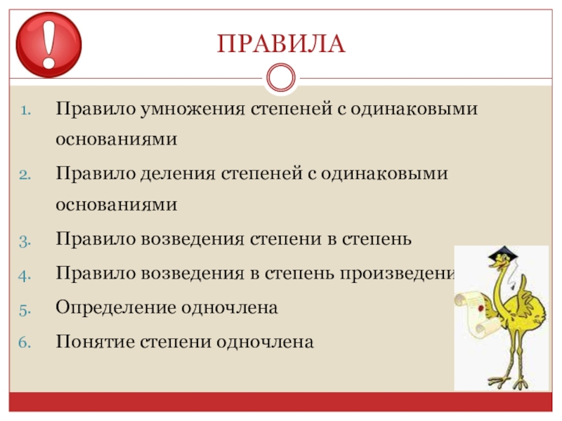 ПРАВИЛАПравило умножения степеней с одинаковыми основаниямиПравило деления степеней с одинаковыми основаниямиПравило возведения степени в степеньПравило возведения в