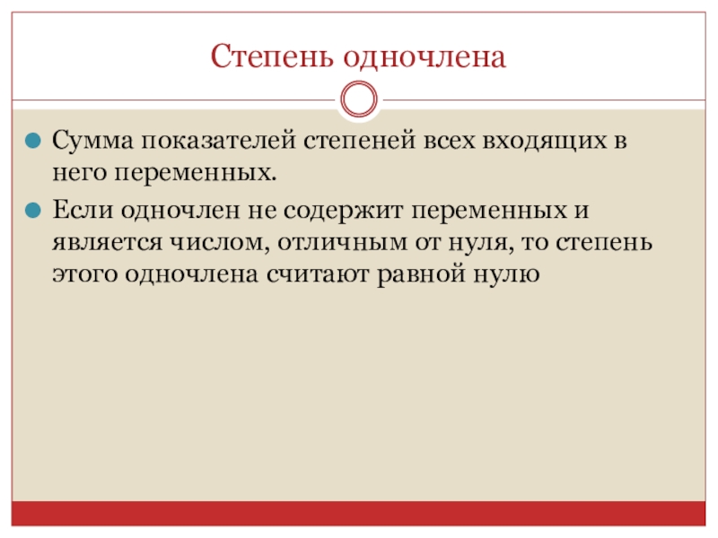 а сумму показателей переменных – степенью одночлена. Степень одночлена, представляющего собой число, считается равной нулю.