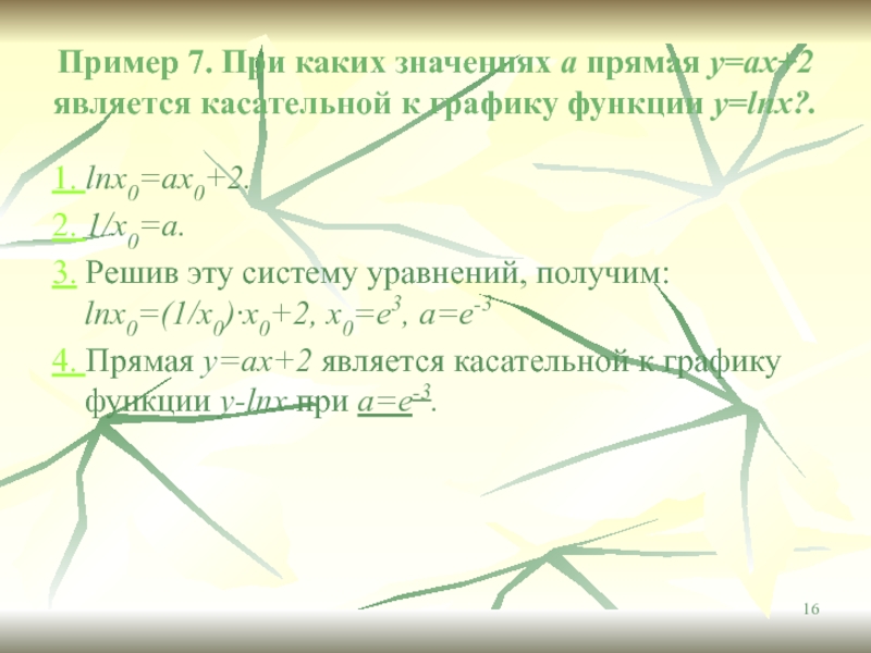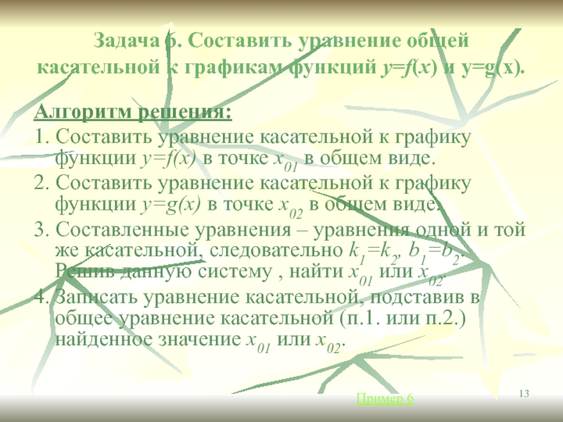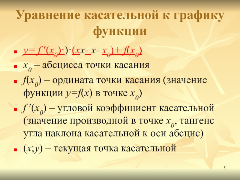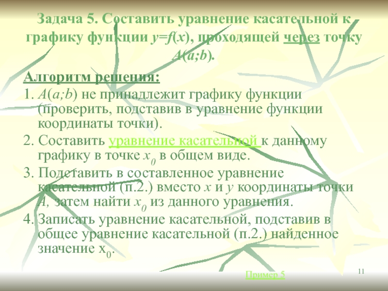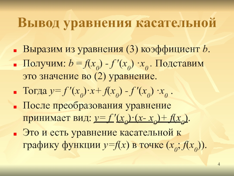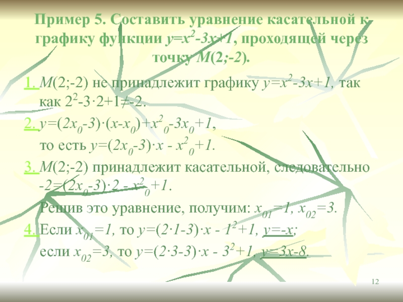 4. Записать уравнение касательной, подставив в общее уравнение касательной (п.2.) найденное значение x0.