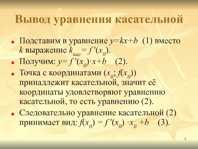 Подставить найденные значения в уравнение касательной y= f ′(x0)·(x- x0)+ f(x0).