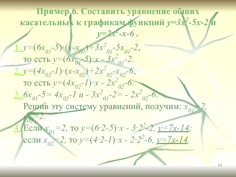 3. Составленные уравнения – уравнения одной и той же касательной, следовательно k1=k2, b1=b2. Решив данную систему , найти x01 или x02.