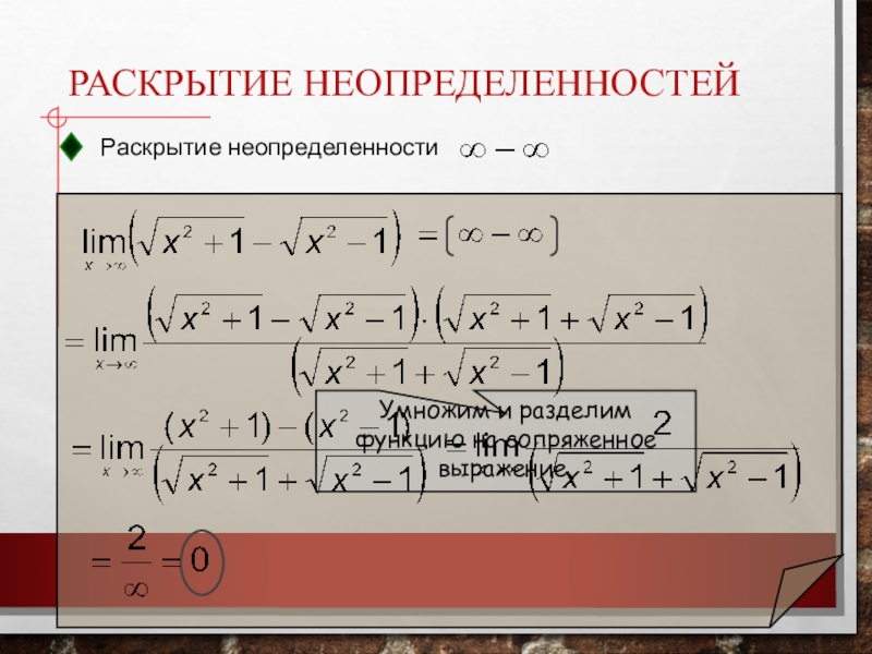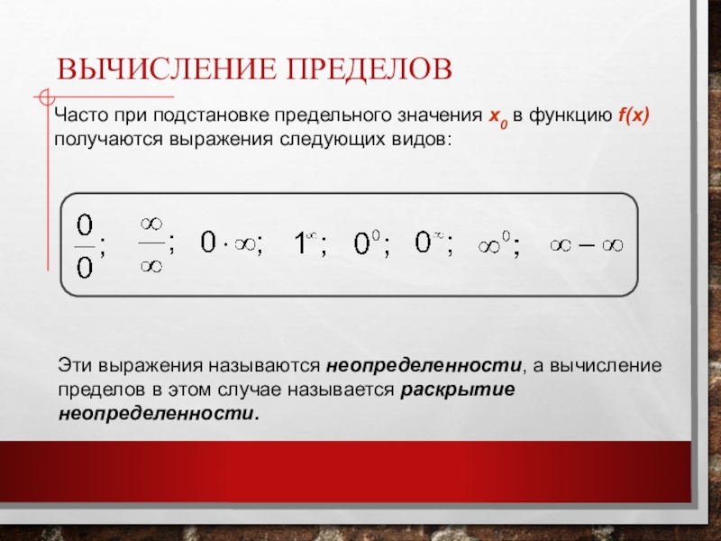Эти выражения называются неопределенности, а вычисление пределов в этом случае называется раскрытие неопределенности.
