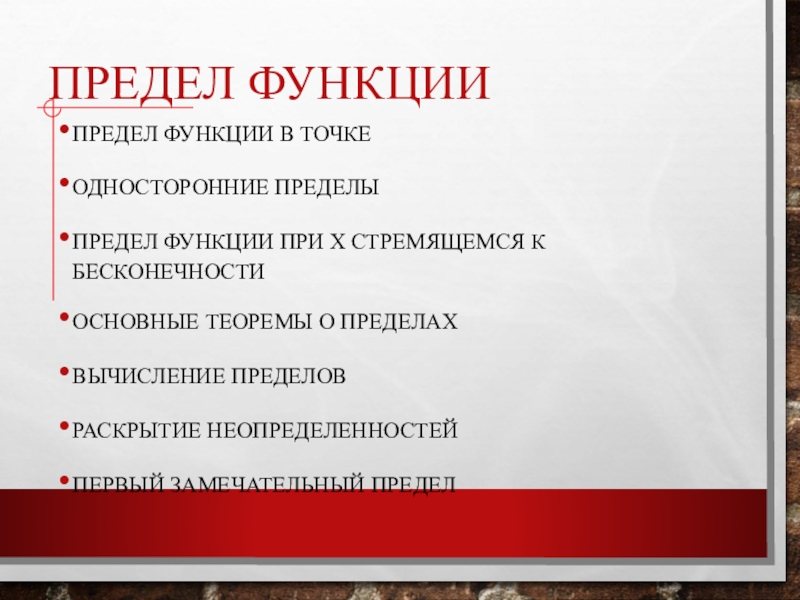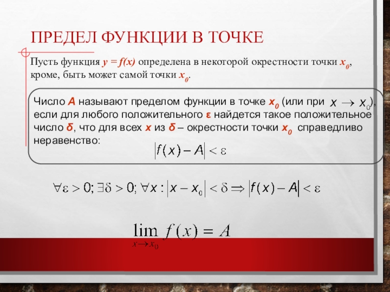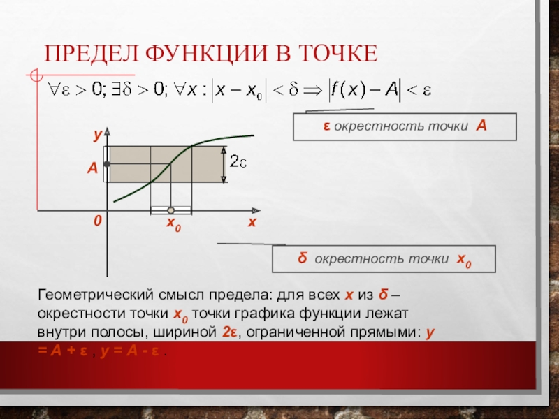 Число А1 называют пределом функции слева в точке x0, если для любого ε > 0 найдется такое δ >0, что для всех справедливо неравенство: