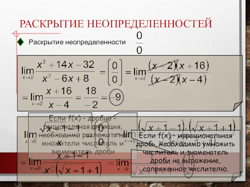 Если f(x) – иррациональная дробь, необходимо умножить числитель и знаменатель дроби на выражение, сопряженное числителю.