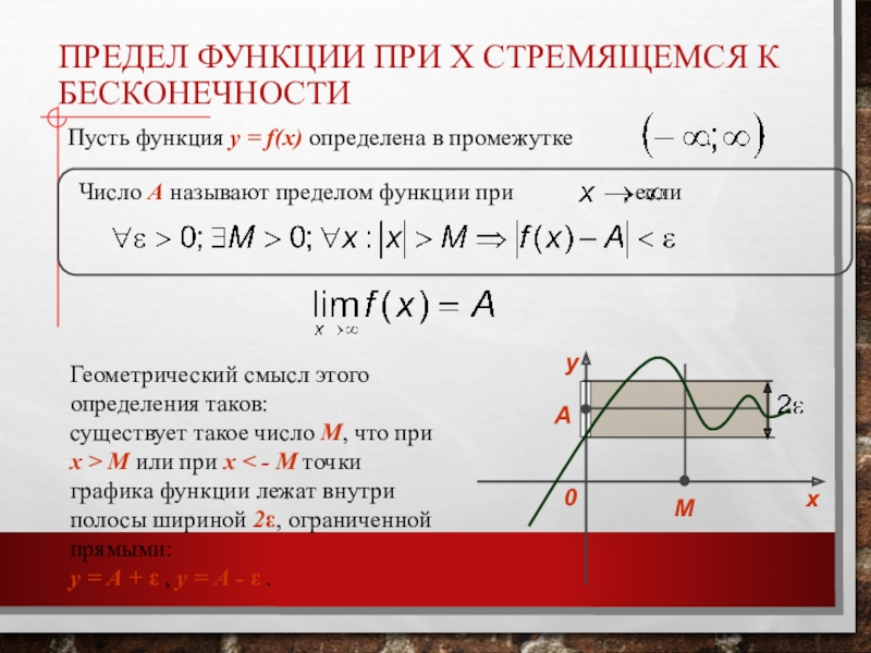 существует такое число М, что при х > M или при x < - M точки графика функции лежат внутри полосы шириной 2ε, ограниченной прямыми: