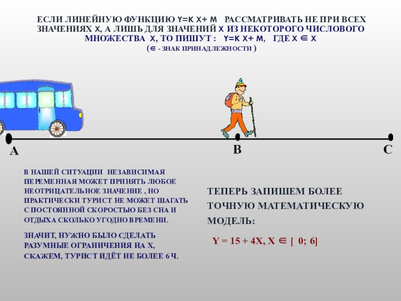 В НАШЕЙ СИТУАЦИИ НЕЗАВИСИМАЯ ПЕРЕМЕННАЯ МОЖЕТ ПРИНЯТЬ ЛЮБОЕ НЕОТРИЦАТЕЛЬНОЕ ЗНАЧЕНИЕ , НО ПРАКТИЧЕСКИ ТУРИСТ НЕ МОЖЕТ ШАГАТЬ С ПОСТОЯННОЙ СКОРОСТЬЮ БЕЗ СНА И ОТДЫХА СКОЛЬКО УГОДНО ВРЕМЕНИ.