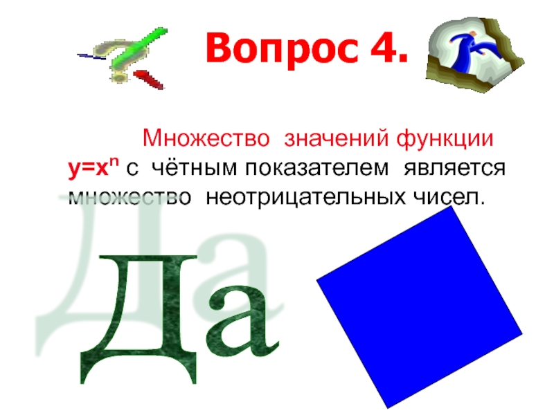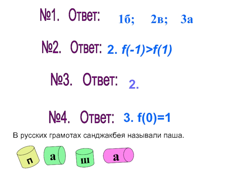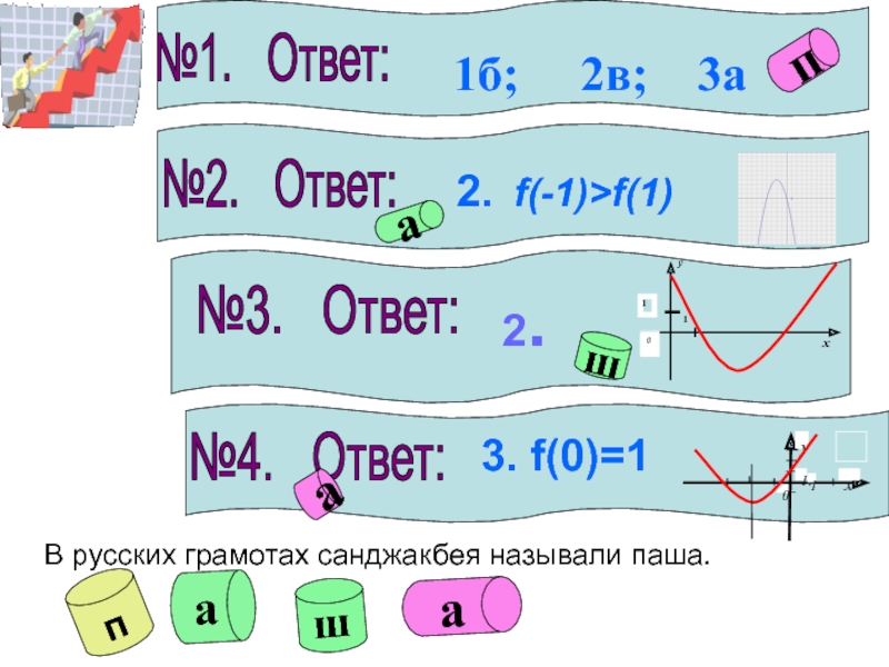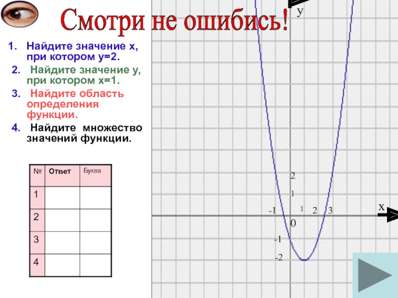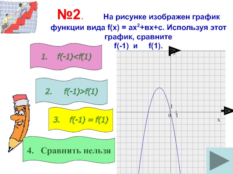 1. f(-1) 2. f(-1)>f(1) 3. f(-1) = f(1) 4. Сравнить нельзя х у 0 1 1
