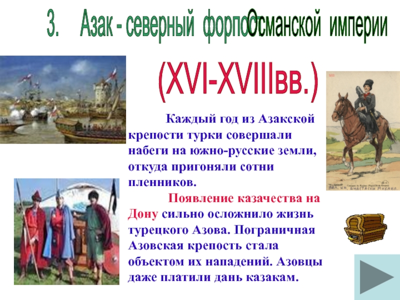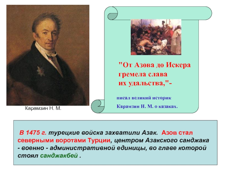 В 1475 г. турецкие войска захватили Азак. Азов стал северными воротами Турции, центром Азакского санджака - военно - административной единицы, во главе которой стоял санджакбей .
