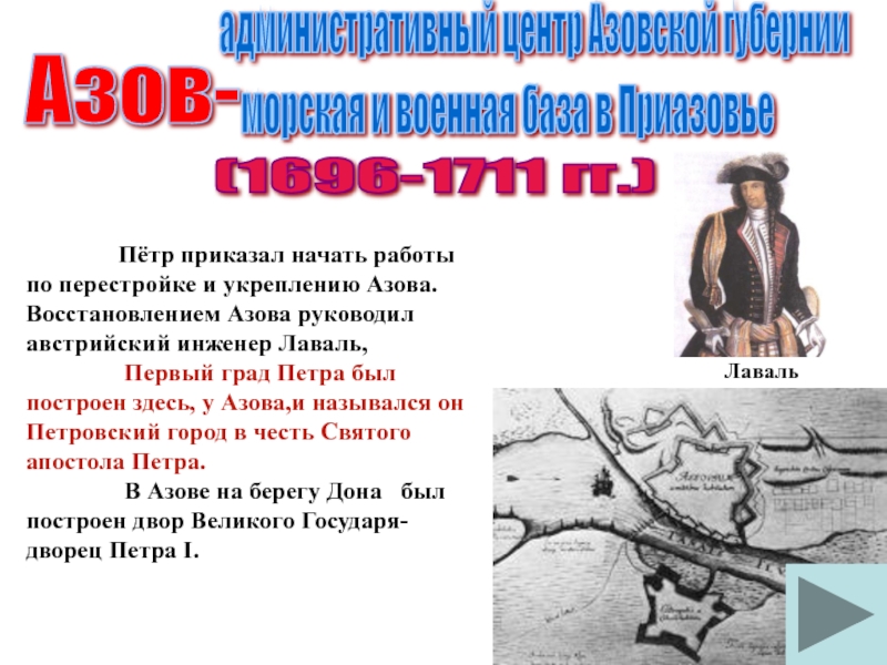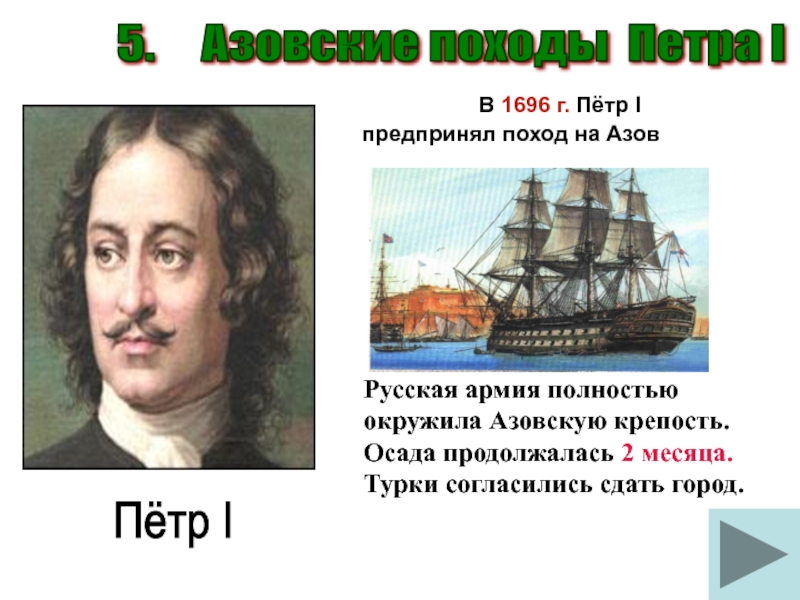 Русская армия полностью окружила Азовскую крепость. Осада продолжалась 2 месяца. Турки согласились сдать город.