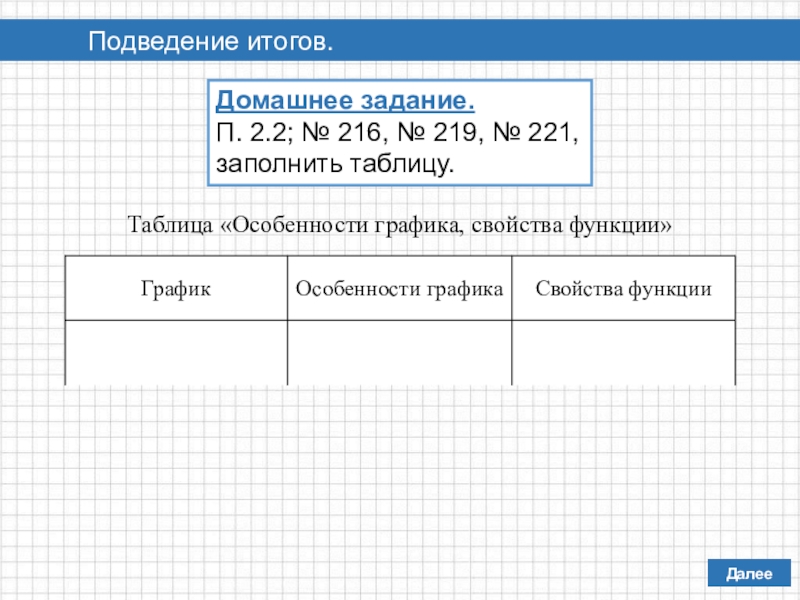 Таблица «Особенности графика, свойства функции»
