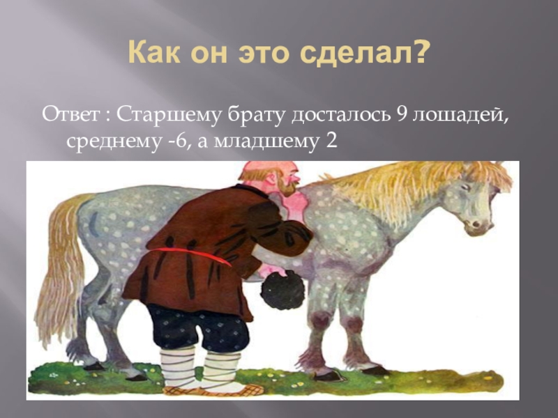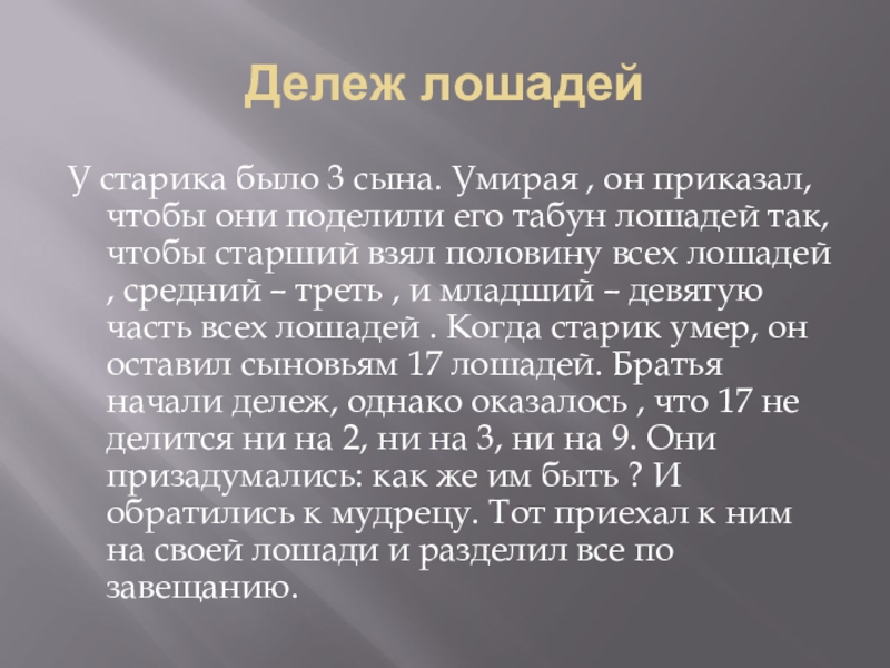они поделили его табун лошадей так, чтобы старший взял половину всех лошадей , средний – треть , и младший – девятую часть всех лошадей . Когда старик умер, он оставил сыновьям 17 лошадей. Братья начали дележ, однако оказалось , что 17 не делится ни на 2, ни на 3, ни на 9. Они призадумались: как же им быть ? И обратились к мудрецу. Тот приехал к ним на своей лошади и разделил все по завещанию.