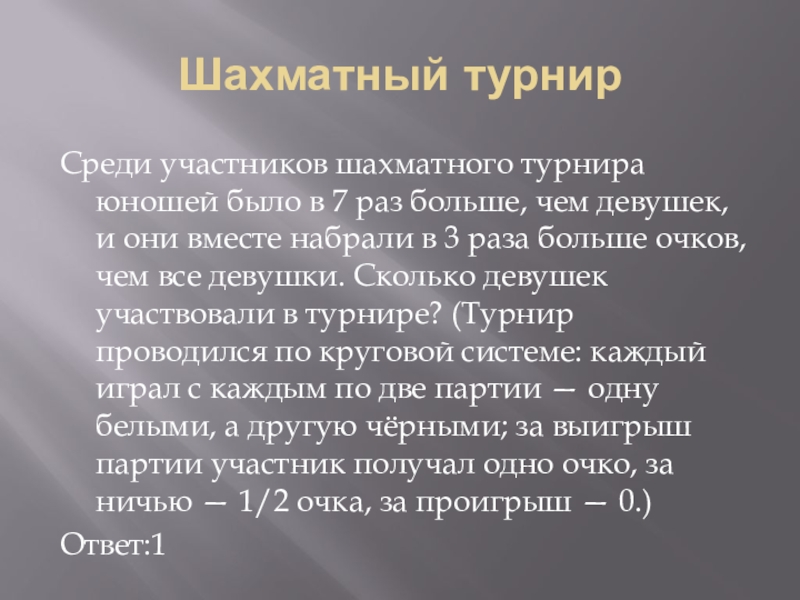 Среди участников шахматного турнира юношей было в 7 раз больше,