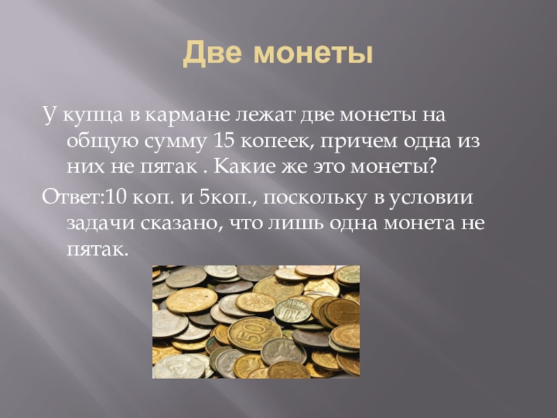 Ответ:10 коп. и 5коп., поскольку в условии задачи сказано, что лишь одна монета не пятак.