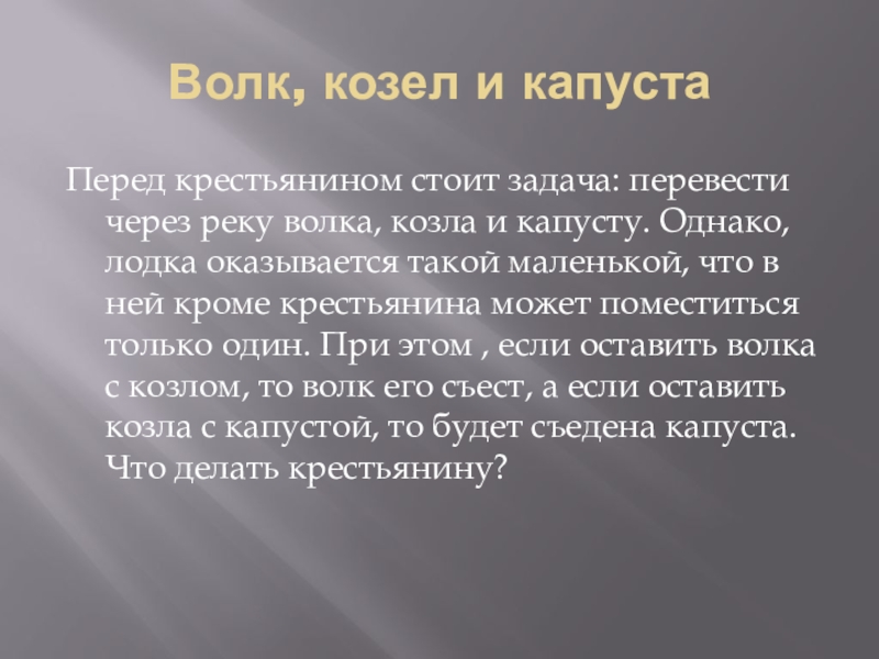 козла и капусту. Однако, лодка оказывается такой маленькой, что в ней кроме крестьянина может поместиться только один. При этом , если оставить волка с козлом, то волк его съест, а если оставить козла с капустой, то будет съедена капуста. Что делать крестьянину?