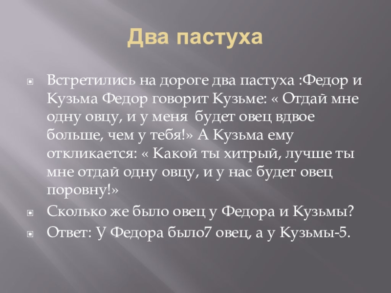Кузьме: « Отдай мне одну овцу, и у меня будет овец вдвое больше, чем у тебя!» А Кузьма ему откликается: « Какой ты хитрый, лучше ты мне отдай одну овцу, и у нас будет овец поровну!»