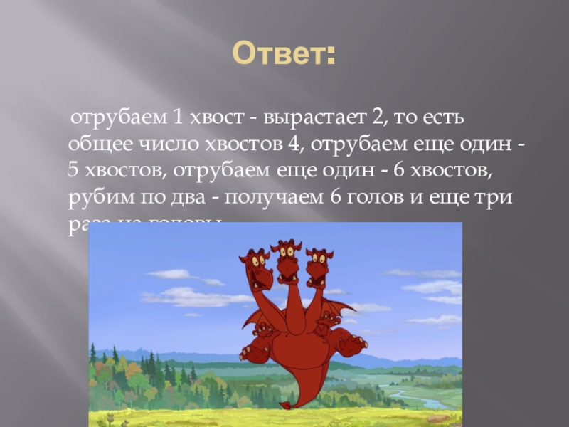 общее число хвостов 4, отрубаем еще один - 5 хвостов, отрубаем еще один - 6 хвостов, рубим по два - получаем 6 голов и еще три раза на головы
