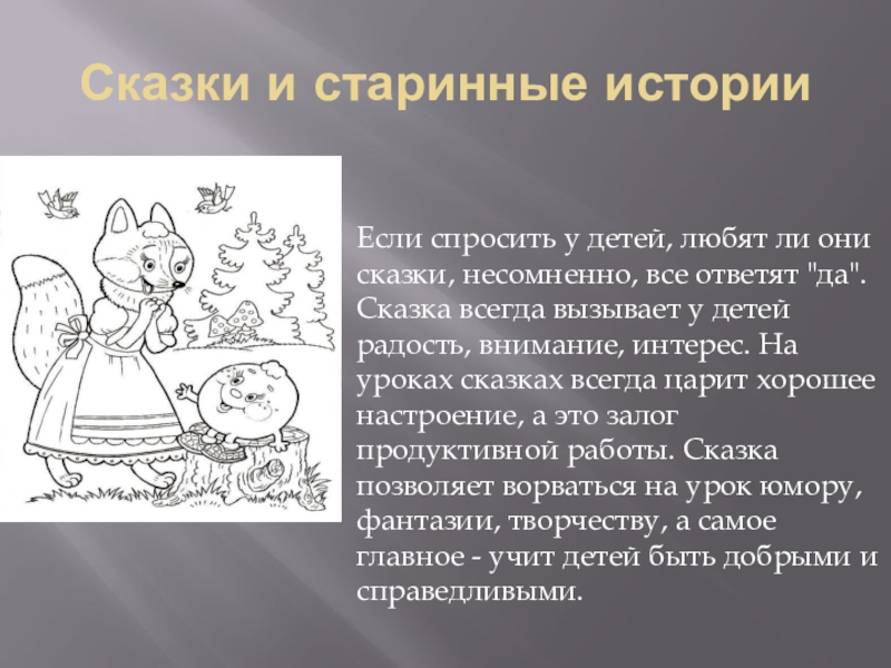 несомненно, все ответят "да". Сказка всегда вызывает у детей радость, внимание, интерес. На уроках сказках всегда царит хорошее настроение, а это залог продуктивной работы. Сказка позволяет ворваться на урок юмору, фантазии, творчеству, а самое главное - учит детей быть добрыми и справедливыми.