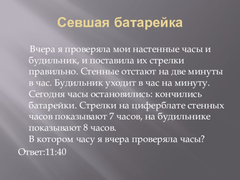 будильник, и поставила их стрелки правильно. Стенные отстают на две минуты в час. Будильник уходит в час на минуту.