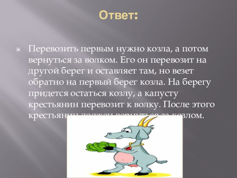 перевозит на другой берег и оставляет там, но везет обратно на первый берег козла. На берегу придется остаться козлу, а капусту крестьянин перевозит к волку. После этого крестьянин должен вернуться за козлом.