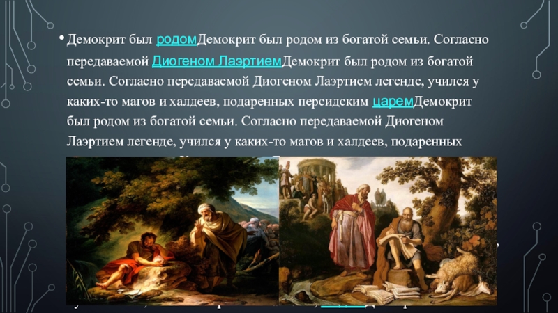 Согласно передаваемой Диогеном Лаэртием легенде, учился у каких-то магов и халдеев, подаренных персидским царемДемокрит был родом из богатой семьи. Согласно передаваемой Диогеном Лаэртием легенде, учился у каких-то магов и халдеев, подаренных персидским царем Ксерксом отцу Демокрита за то, что тот угостил проходившее через Фракию персидское войско обедом. По смертиДемокрит был родом из богатой семьи. Согласно передаваемой Диогеном Лаэртием легенде, учился у каких-то магов и халдеев, подаренных персидским царем Ксерксом отцу Демокрита за то, что тот угостил проходившее через Фракию персидское войско обедом. По смерти отца истратил свою часть богатого наследства на путешествия, посетив Персию и Вавилон, ИндиюДемокрит был родом из богатой семьи. Согласно передаваемой Диогеном Лаэртием легенде, учился у каких-то магов и халдеев, подаренных персидским царем Ксерксом отцу Демокрита за то, что тот угостил проходившее через Фракию персидское войско обедом. По смерти отца истратил свою часть богатого наследства на путешествия, посетив Персию и Вавилон, Индию и Египет.