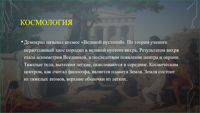 в великой пустоте вихрь. Результатом вихря стала асимметрия Вселенной, в последствии появление центра и окраин. Тяжелые тела, вытесняя легкие, скапливаются в середине. Космическим центром, как считал философа, является планета Земля. Земля состоит из тяжелых атомов, верхние оболочки из легких.