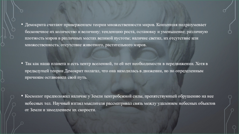Демокрита считают приверженцем теории множественности миров. Концепция подразумевает бесконечное их количество