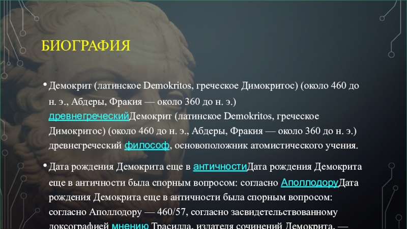 — около 360 до н. э.) древнегреческийДемокрит (латинское Demokritos, греческое Димокритос) (около 460 до н. э., Абдеры, Фракия — около 360 до н. э.) древнегреческий философ, основоположник атомистического учения.
