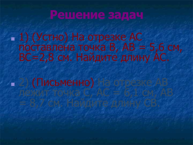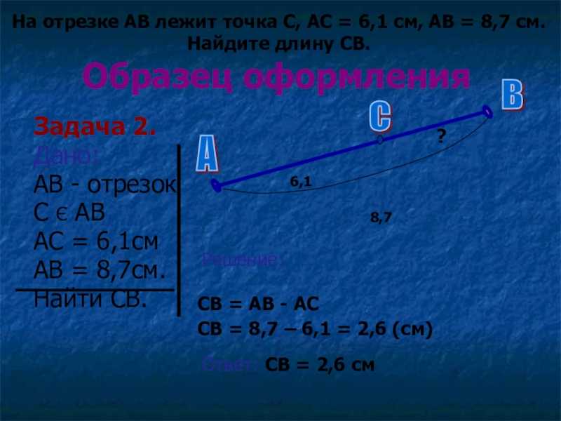 На отрезке АВ лежит точка С, АС = 6,1 см, АВ = 8,7 см.