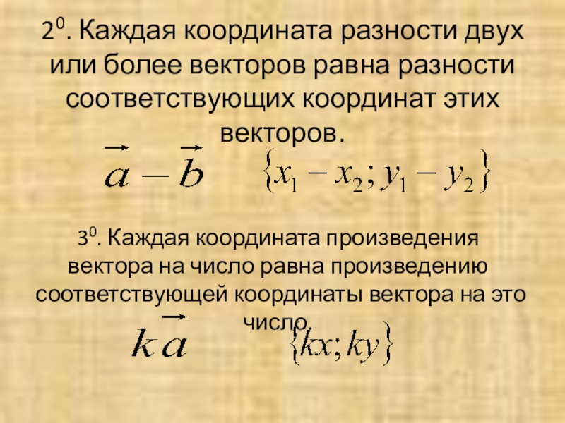 30. Каждая координата произведения вектора на число равна произведению соответствующей координаты вектора на это число.