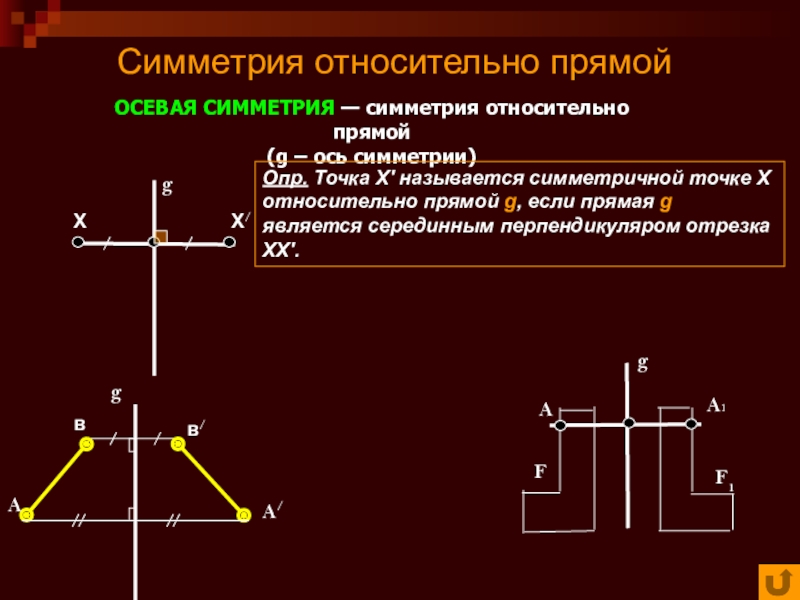 Опр. Точка X' называется симметричной точке X относительно прямой g, если прямая g является серединным перпендикуляром отрезка XX'.