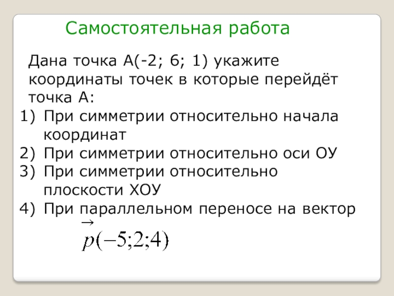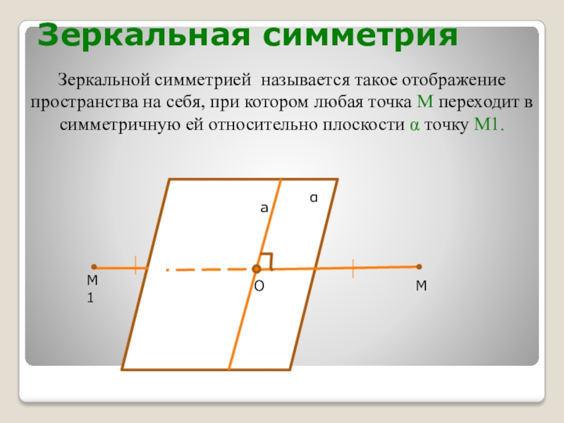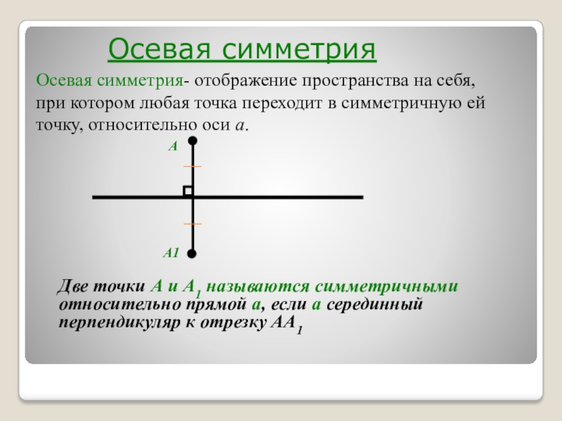 Осевая симметрия- отображение пространства на себя, при котором любая точка переходит в симметричную ей точку, относительно оси а.
