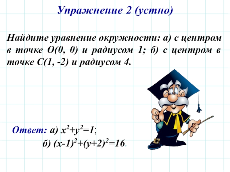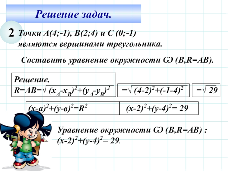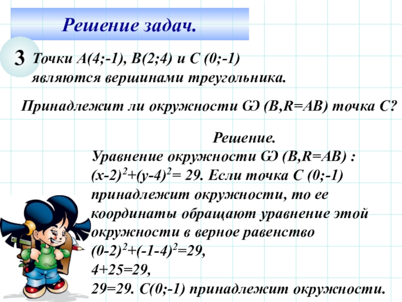 Уравнение окружности Ѡ (В,R=АВ) : (х-2)2+(у-4)2= 29. Если точка С (0;-1) принадлежит окружности, то ее координаты обращают уравнение этой окружности в верное равенство